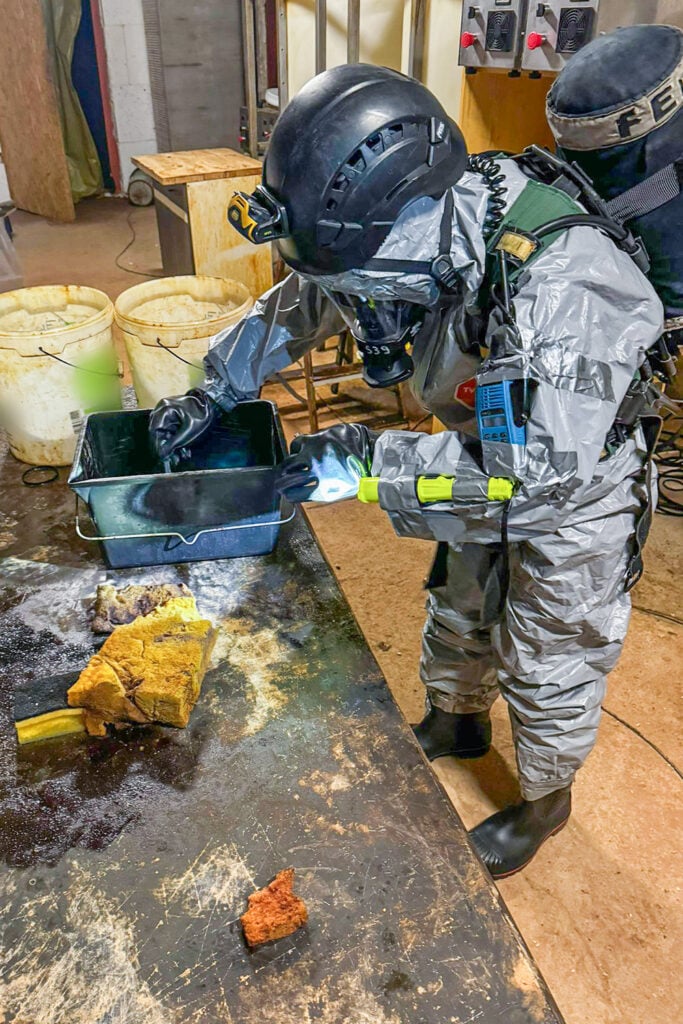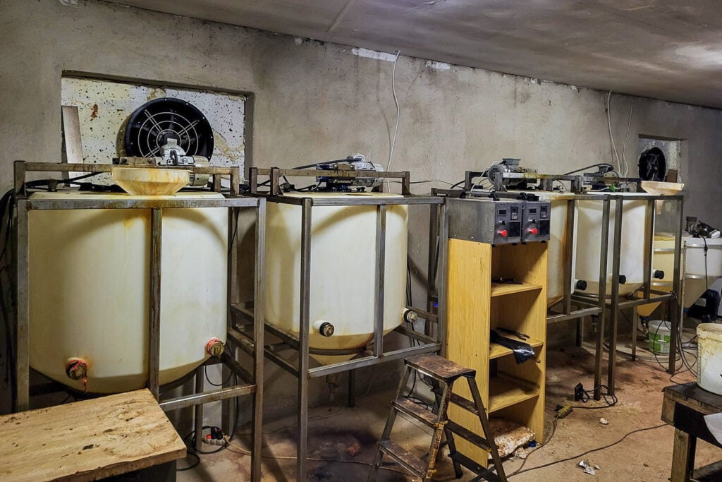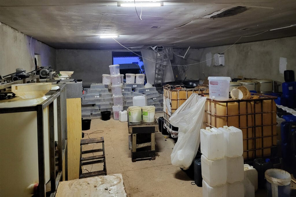 Podczas przeszukania wytypowanej posesji mundurowi ujawnili kompletną linię technologiczną służącą do wytwarzania syntetycznych narkotyków. Na miejscu zabezpieczono ponad 200 kilogramów gotowego klofedronu w formie kryształu oraz 500 litrów substancji w postaci płynnej.